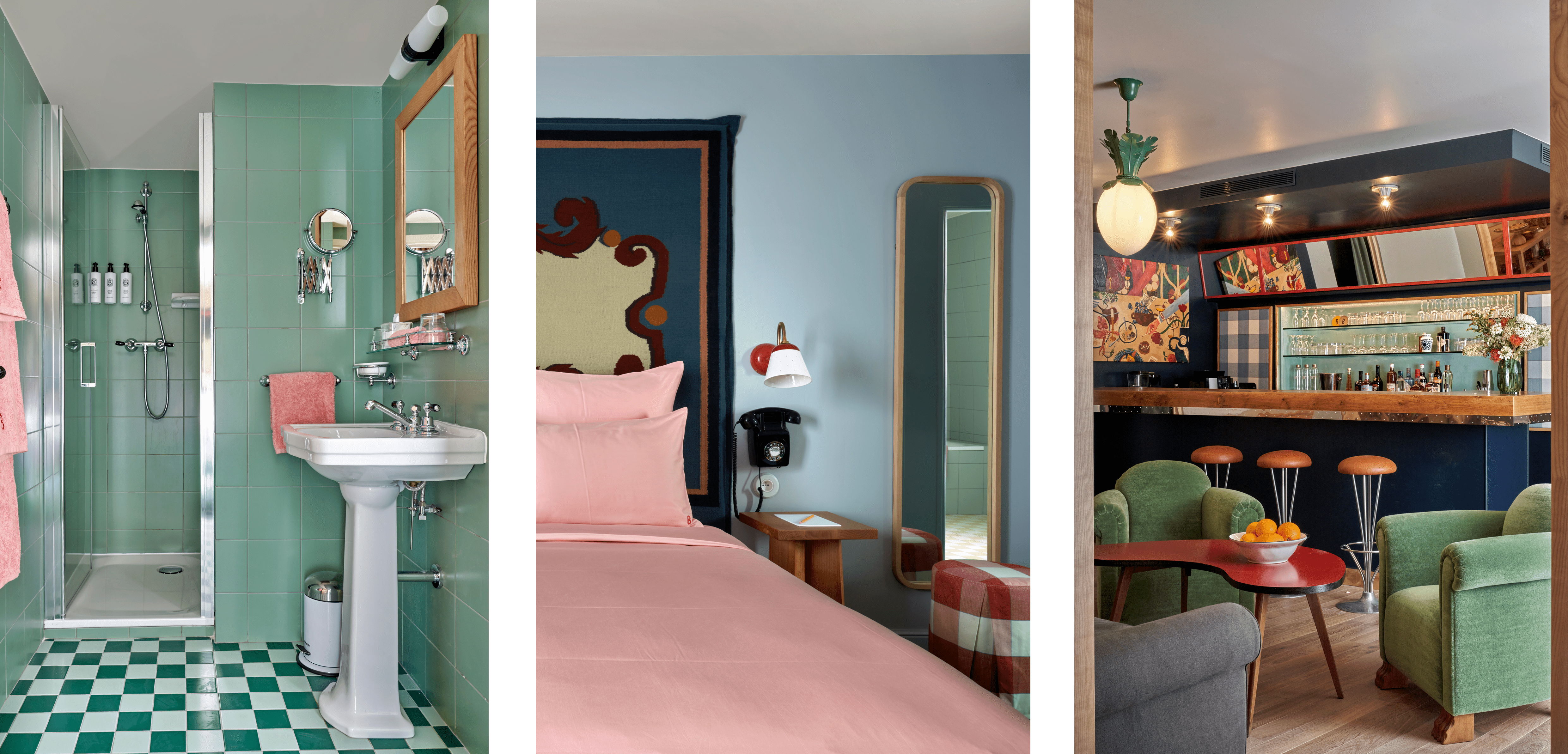 D’une bâtisse dans son jus, l’architecte et designeuse Beata Heuman a conservé les codes historiques et l’héritage, à l’image du lobby en marbre et de son enseigne de réception rétro. Débute ici une certaine symphonie des époques, un patchwork à l’harmonie assumée où le XXe siècle rencontre les tendances actuelles. Par exemple, c’est lors d’un voyage à Florence que les sols en marbre des chapelles des Médicis ont inspiré à Beata Heuman les têtes de lit tressées, tendues comme des tapisseries — « le » détail déco repéré chez les architectes d’intérieur, notamment à l’hôtel Beauregard.