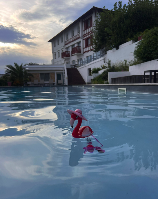 Je suis à l’hotel Itsas Mendia, à Bidart. Établissement familial, tenu par Maider Etchayde, 4eme génération depuis les fondateurs du lieu. Parfois j’ai l’esprit anti-grégaire des surfeurs qui ne donnent pas leur « secret spots », mais là je me dois de partager cet hotel magique, à 1 minute du fronton du centre ville et de la mairie, à 5 minutes à pied de la plage par un chemin dans la nature, et avec une de mes piscines préférées.